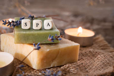 Green and yellow soaps with a scented candle in a romantic setting. Spa concept on wooden background. wellness concept.