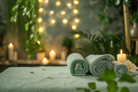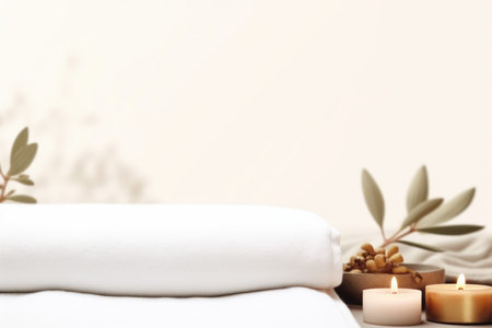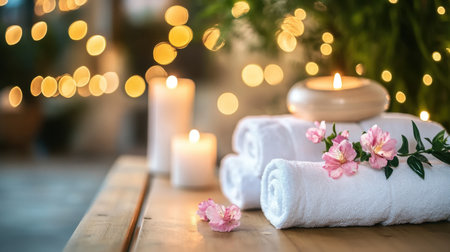 This serene spa scene features soft candles, fresh flowers, and cozy towels, creating a tranquil ambiance perfect for relaxation and rejuvenation. Ideal for wellness concepts.