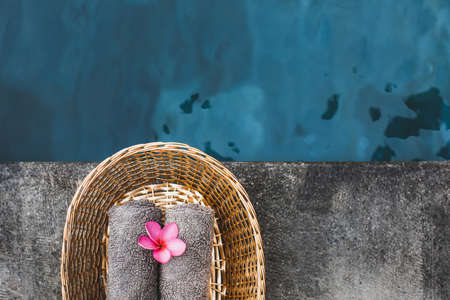 Two gray hand towels in wicker basket on poolside in hotel spa. Pink frangipani flower as decoration. Beauty treatment.
