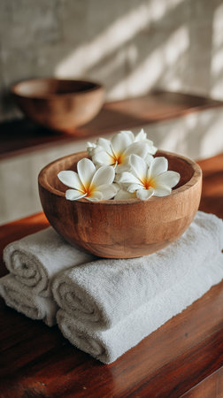 Calm and soothing spa scene featuring a wooden bowl filled with white flowers and folded towels on a wooden surface. Soft light filters through the window. AI Generative