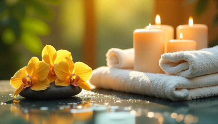 Spa still life with candles, orchids, and soft towels