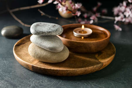 Wooden tray with stack of spa stones on dark background