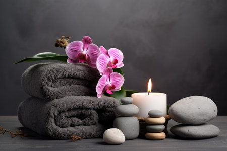 Spa ambiance with pink orchid, candles, and stones on gray backdrop