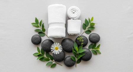 Smooth showing serene spa arrangement with white rolled towels, smooth black stones, green leaves, and a white daisy flower keywords: spa, wellness,...