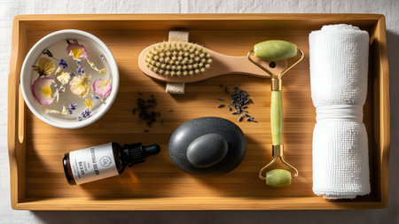 Top view of natural spa beauty products on wooden tray. Items include essential oil, jade roller, brush, and flowers for self-care routine.