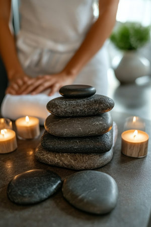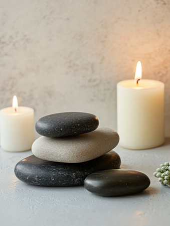 Smooth massage stones stacked artfully beside lit candles create a serene ambiance, providing a perfect space for relaxation and rejuvenation.