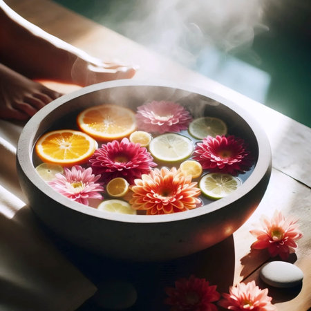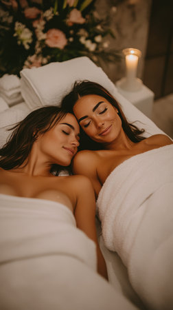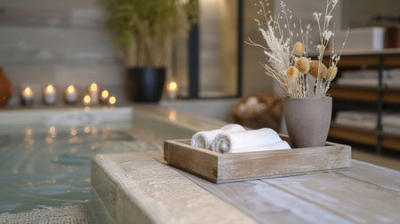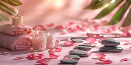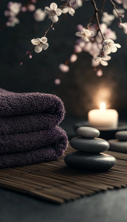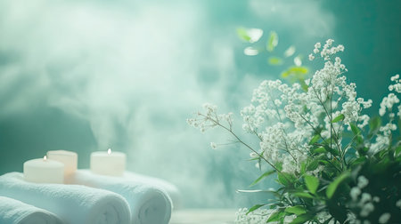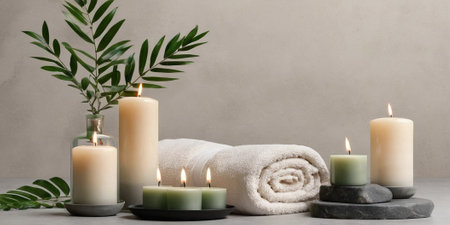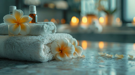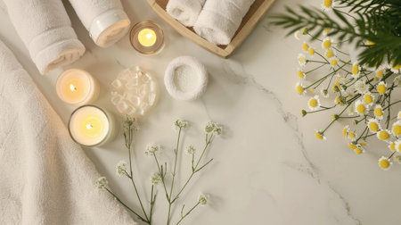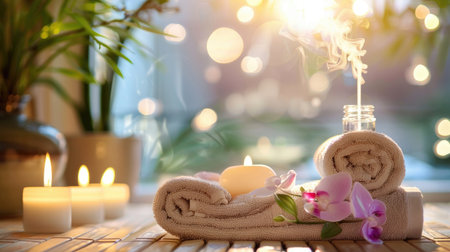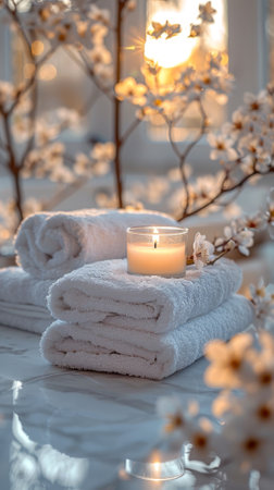 This serene spa scene features soft candles, fresh flowers, and cozy towels, creating a tranquil ambiance perfect for relaxation and rejuvenation. Ideal for wellness concepts.