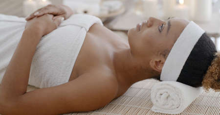 Smiling Asian woman in white headscarf and bath towel lie down and sleeping on bed preparing for massage therapy at alternative medicine healing spa Center in Thailand