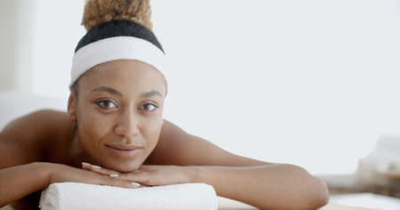 Young woman relaxing at beauty spa by candle light and looking at camera