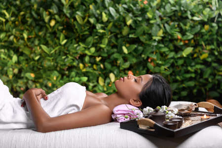 Beautiful young woman relaxed in spa salon,Traditional aroma therapy and beauty treatments, Outdoor spa in gardens and natural light.