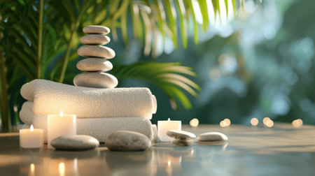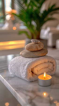 Discover a serene spa setting featuring a rolled towel and smooth stones, illuminated by gentle candlelight, perfect for relaxation and rejuvenation during wellness treatments.