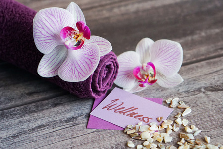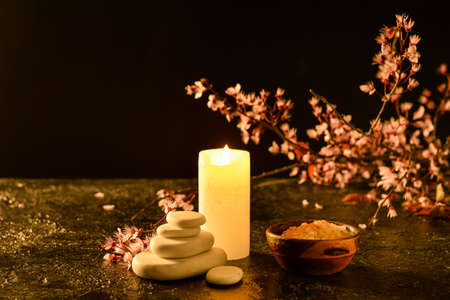 Spa still life with scented candles, stones, flowers and a bath towel. Horizontal photo. Horizontal photo.