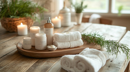 A tranquil spa scene with beef tallow-based skincare products like a face mask, moisturizer, and body lotion on a wooden tray, surrounded by candles, rolled towels, and the soothing scent of essential oils.