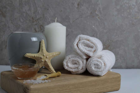 spa massage home care relax. Towels white candles scrub clay salt lie on a tray on a gray background with space for text.