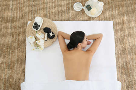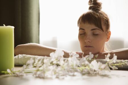 Young woman spending day in spa salon. She is sitting next to tray with towels and essential oils