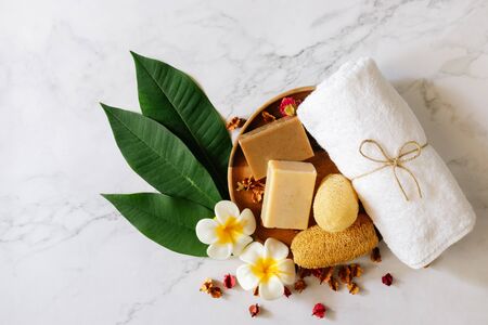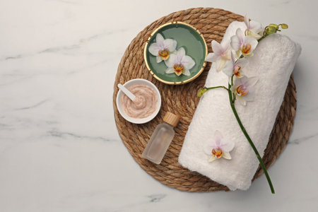 Composition with different spa products and flowers on white marble table, top view. Space for text