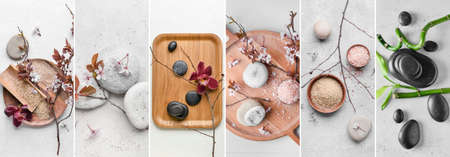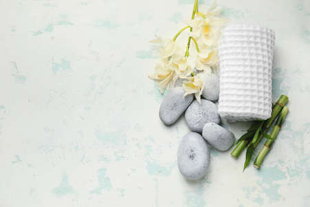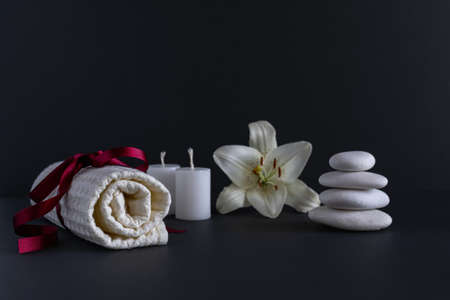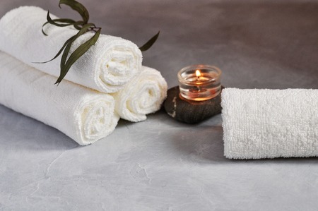 Close up view of Spa relax concept. White Terry towels, stones, candle and a branch on a gray textured background.