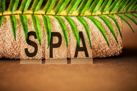 White soap with a label and pink towel lies on a white background lies on a green leaf of a palm tree. word Spa made of wooden letters