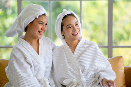 Couple Asian pretty women look enjoy happy and relax together after spa massage and stay in reception room of the shop with day light.