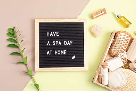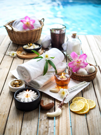 Exquisite display of beauty treatment and spa salon accessories arranged on spa table in luxury spa resort. Relaxing spa massage and recreation background concept. Quiescent