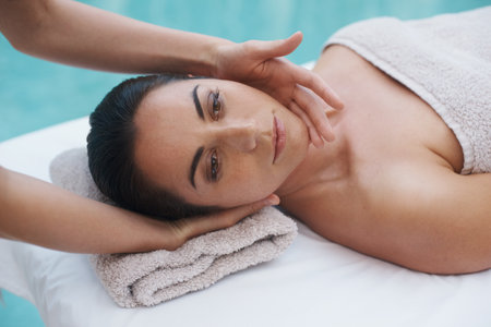 One of lifes little pleasures. a woman enjoying a massage beside a pool.