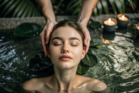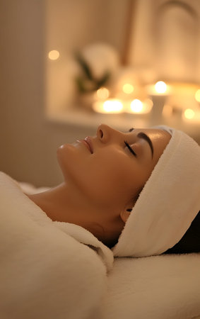 A tranquil spa scene featuring a serene woman enjoying a rejuvenating treatment. The warm candlelight enhances the calming atmosphere, promoting relaxation.