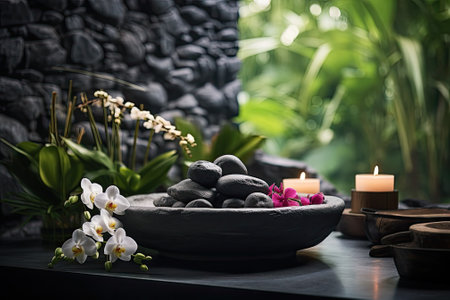 Experience a serene spa environment with black stones, a soft towel, and aromatic lavender in a wooden bowl, perfect for relaxation and wellness treatments.
