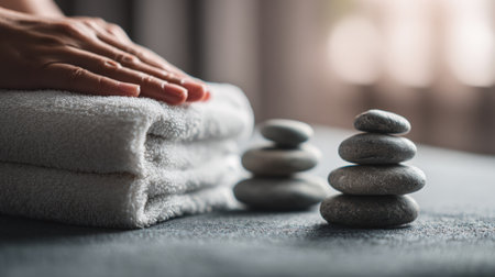A calming wellness scene featuring a therapist's hand on towels, with spa stones in the background. The minimalist setting and soft lighting enhance the relaxing atmosphere.