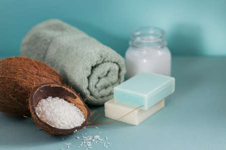 Organic coconut cosmetic oil and natural handmade soap with coconut
