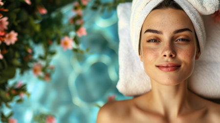 Relaxing woman enjoys spa treatment with towels and serene decor in a coastal setting. Generative AI