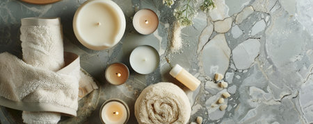 A flat lay of premium spa products, such as rich body lotions, fragrant candles, and a soft loofah, elegantly placed on a smooth stone surface.