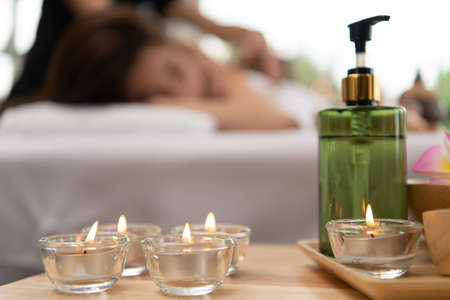 Spa beauty massage health wellness. Spa Thai therapy treatment aromatherapy for body woman with white flower nature candle for relax and summer time. Lifestyle and cosmetic Concept
