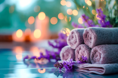 A collection of plush lavender towels rests on a surface surrounded by delicate flowers and flickering candles, creating a tranquil atmosphere perfect for relaxation.