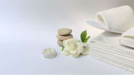 Spa setting and Spa background composition with white gardenia flower on white background. Banner Towel, candles, flowers, stones. Massage, oriental therapy, wellbeing and meditation.
