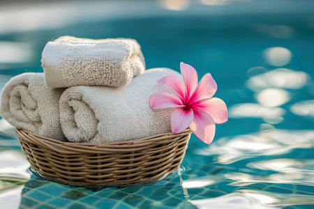 Two gray hand towels in wicker basket on poolside in hotel spa. Pink frangipani flower as decoration. Beauty treatment.