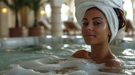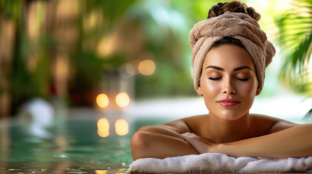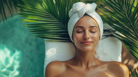 A serene portrait of a woman relaxing in a tropical setting, with a towel on her head and a radiant glow, embodying wellness and tranquility.