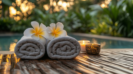 Serene and luxurious spa setup with wooden bath essentials, greenery, and candles near a pool, creating a calming and rejuvenating ambiance.