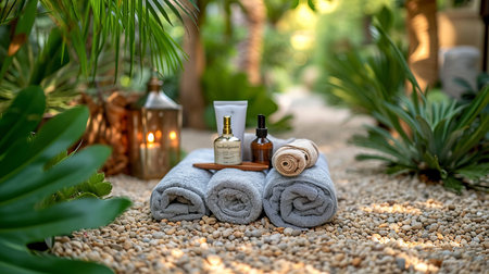 Spa center setting with towels, herbal bags, and beauty treatment items