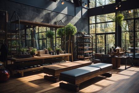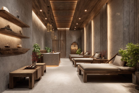 An inviting spa interior presents massage tables, comfortable seating, and decor. The scene is illuminated by overhead lighting, casting soft shadows across the wood and textured walls. The design incorporates natural elements suggesting a serene and restorative environment. Suitable for wellness, healthcare, and lifestyle publications.