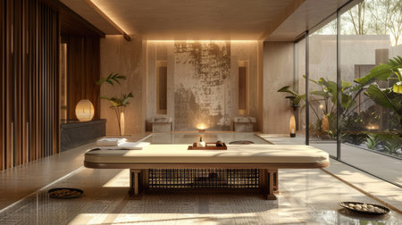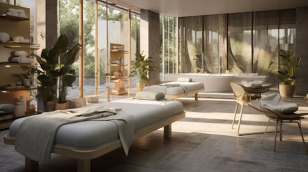 Experience the tranquility of this serene spa interior, where natural light and elegant decor create a calming atmosphere for relaxation and rejuvenation.