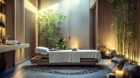 This interior scene showcases a spa-like environment, featuring stacked stones, lush bamboo, and a tranquil water element. The color palette emphasizes natural tones with wood and greenery accents. The composition suggests a serene atmosphere, potentially suitable for wellness, relaxation, or meditation-themed projects, and commercial usage.