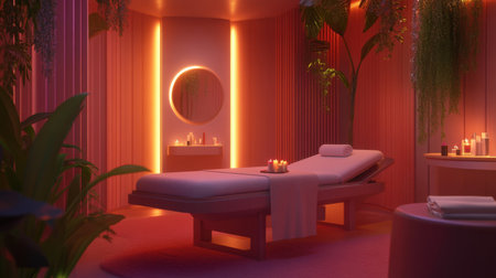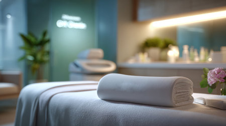 A serene spa interior featuring soft lighting and clean towels. This inviting space promotes relaxation and rejuvenation, perfect for wellness experiences.