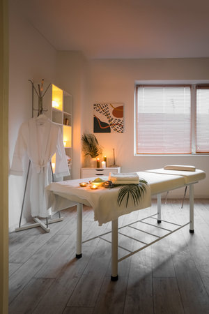 Interior of new beauty salon with spa massage table and set of skincare products ready for use