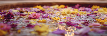 Colorful flower petals floating on water surface with shallow depth of field