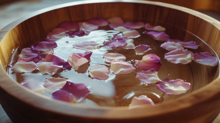 A serene wooden bowl filled with clear water and delicate rose petals creates a calming atmosphere perfect for relaxation and wellness experiences.