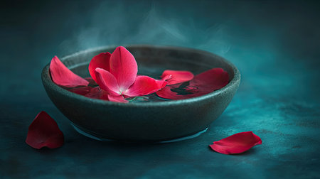 A stunning close-up of a dark bowl filled with water, adorned with vibrant red petals and wisps of steam, creating a serene atmosphere for relaxation.