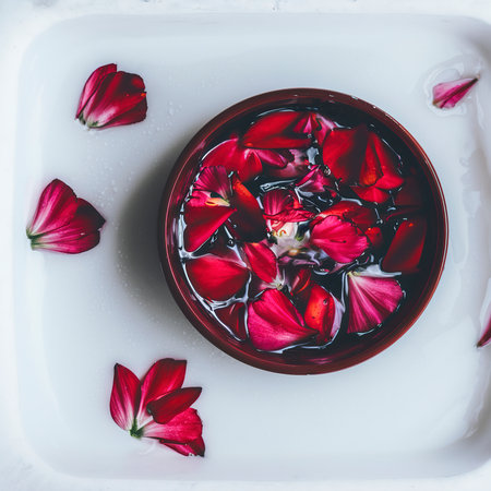 Delicate petals lay scattered across a smooth surface evoking tranquility and calmness.