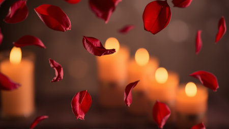 Rose petals falling down against the background of burning candles