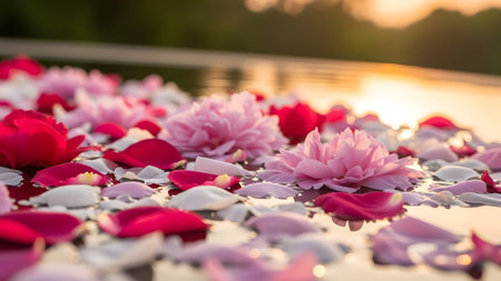 A tranquil lake scene at sunset, adorned with floating rose petals and flowers, creating a peaceful and romantic ambiance.