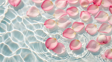 A creative shot of rose petals floating on the surface of clear water, with soft ripples adding texture to the scene.